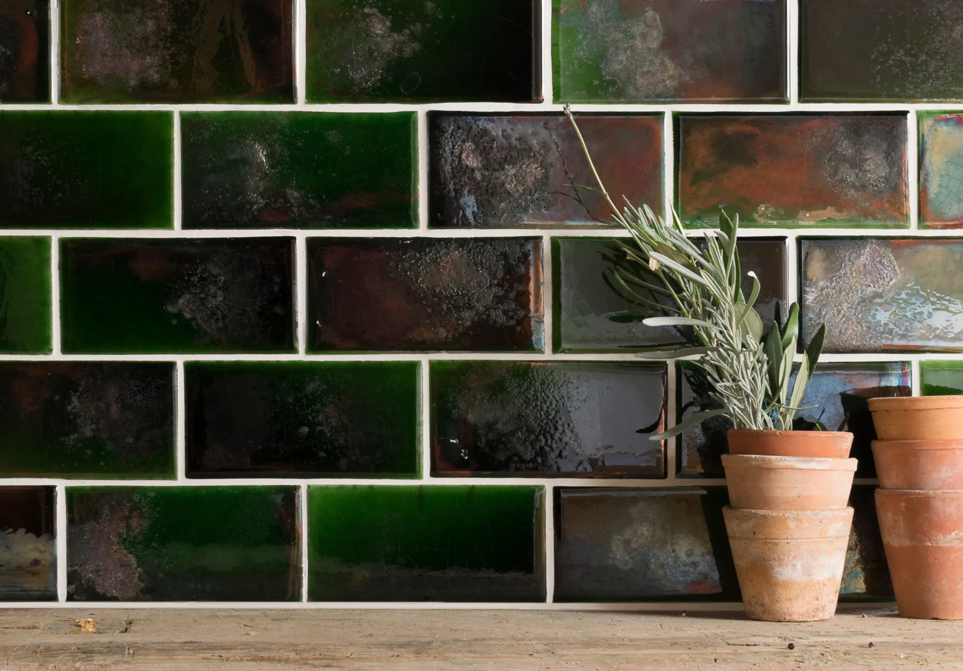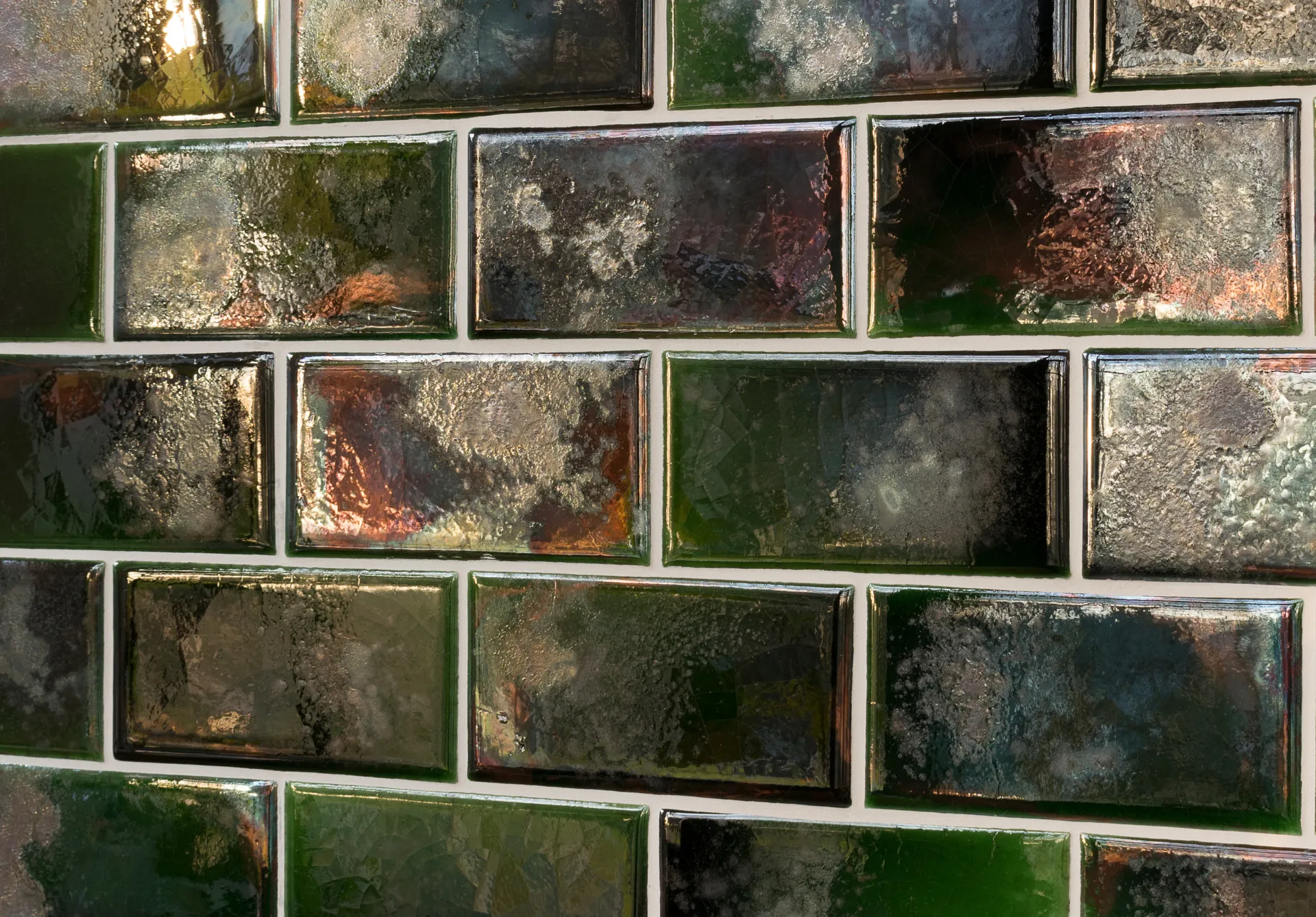 Reminiscent of the Aurora Borealis, the inspiration behind the name of these tiles, the Raku Aurora contains an explosion of jewel-like tones including emerald, crimson, violet and copper. Traditional Japanese techniques have been used to achieve the rich tones and give a vibrancy to the tiles. The sudden cooling of the tiles, once they have been removed from the kiln, causes crazing, which dances across the surface of the tiles, enhancing the different textures and tones in the Raku. Finished with a gloss glaze, these tiles would create a stunning splashback in a kitchen or as a statement in a bathroom.