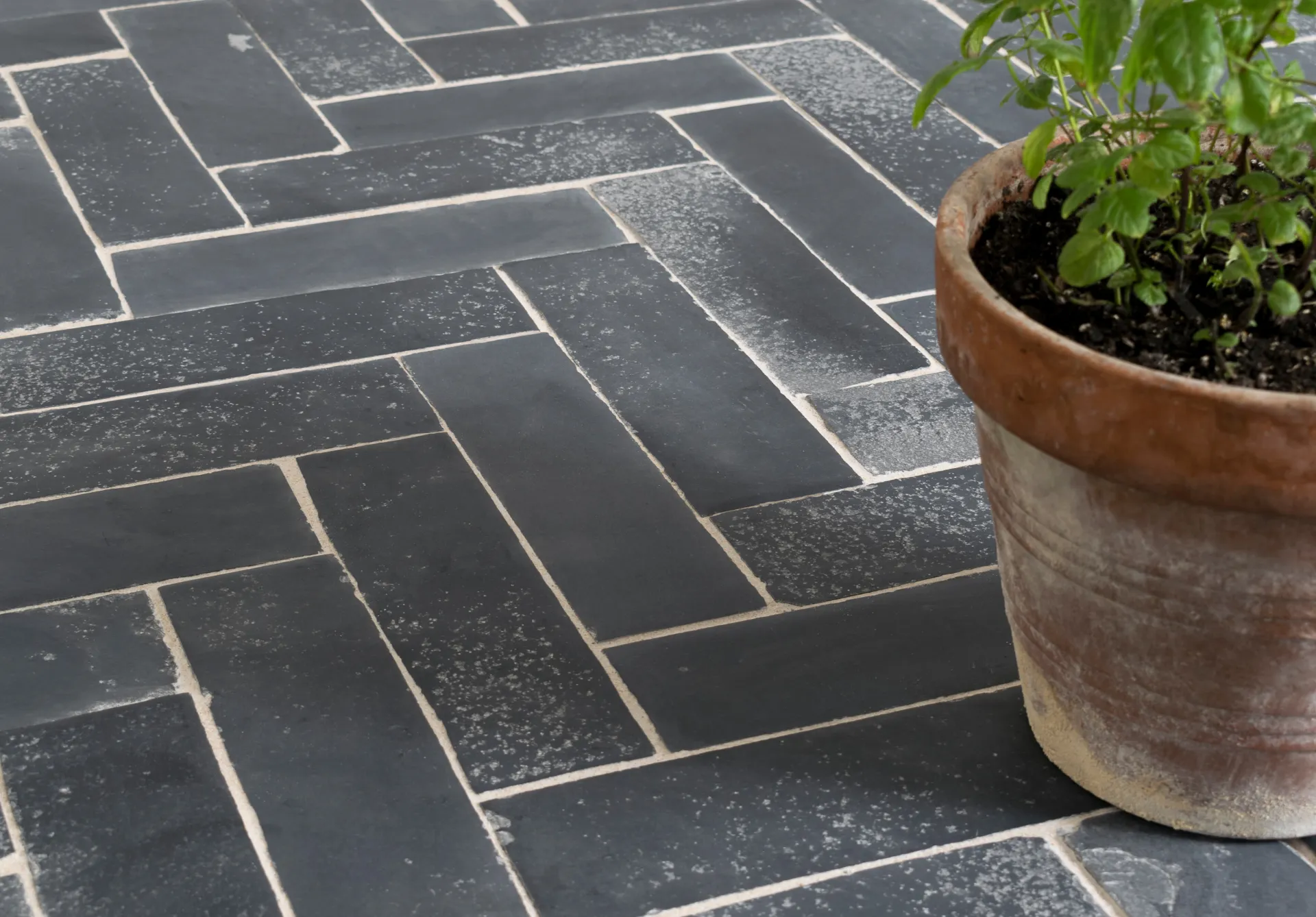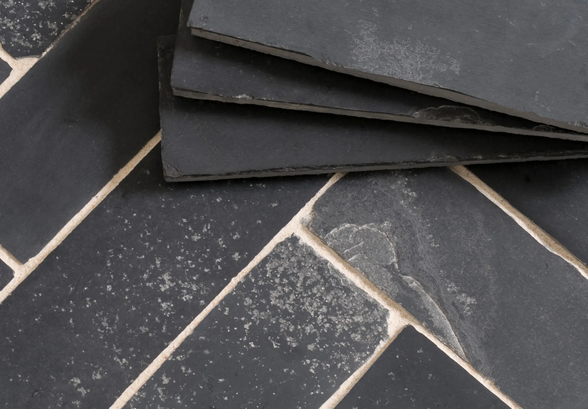 A distressed black limestone, ideally sized for laying in a herringbone pattern. This hard-wearing stone can be used both internally and externally.