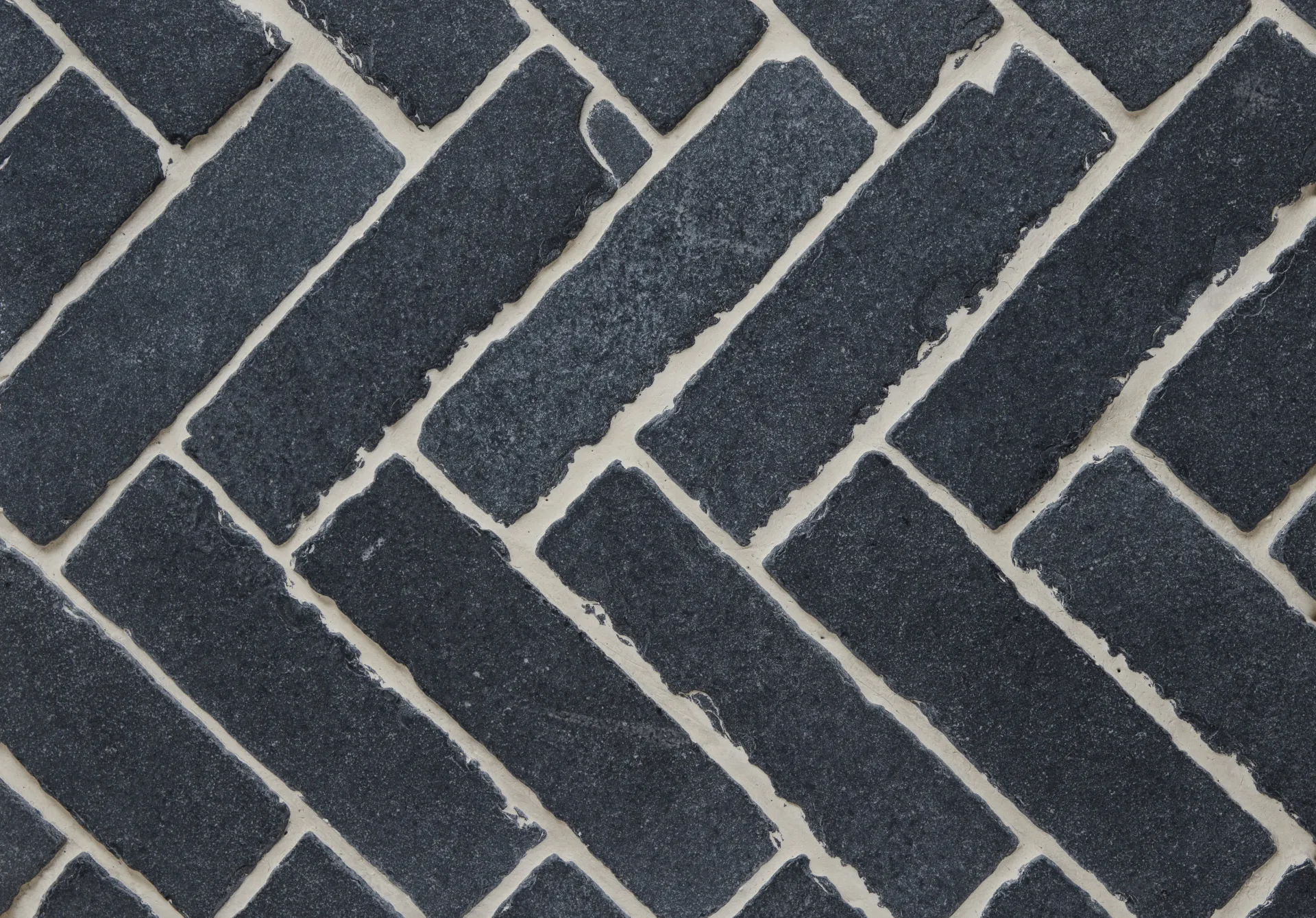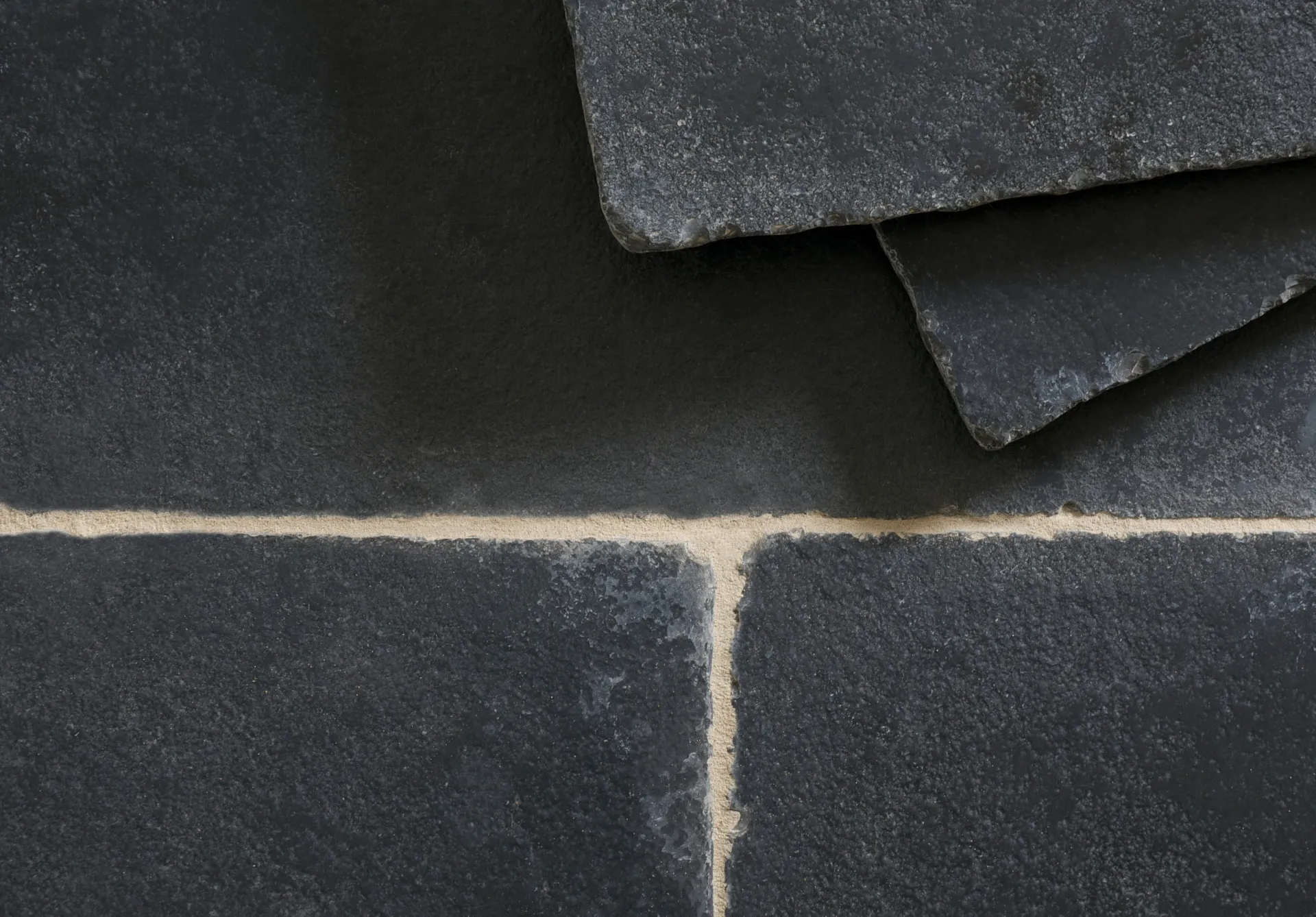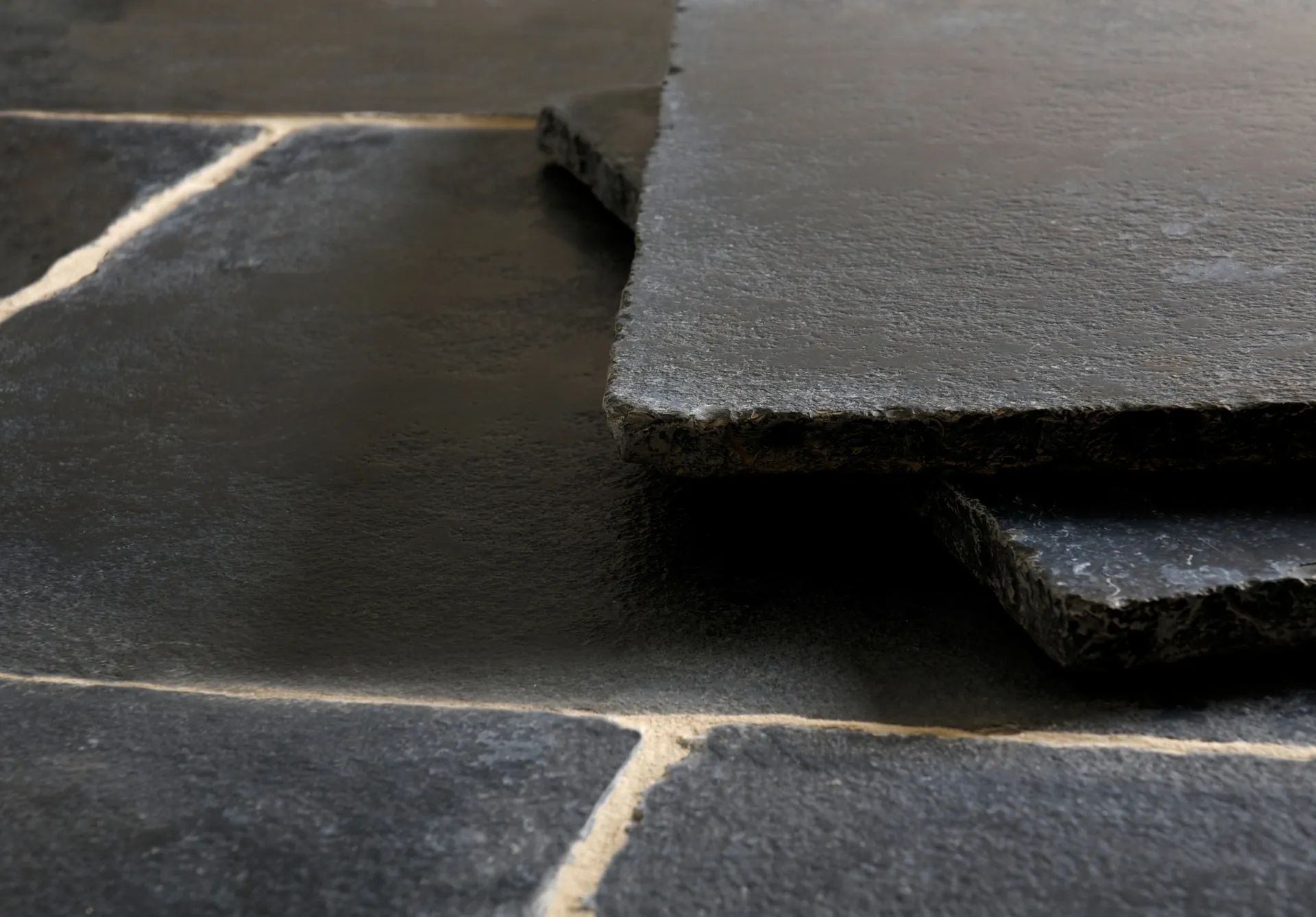 A dark black to charcoal limestone. An extremely hard wearing stone that is very stain resistant. A riven surface that is brushed and part honed with a hand dressed edge.