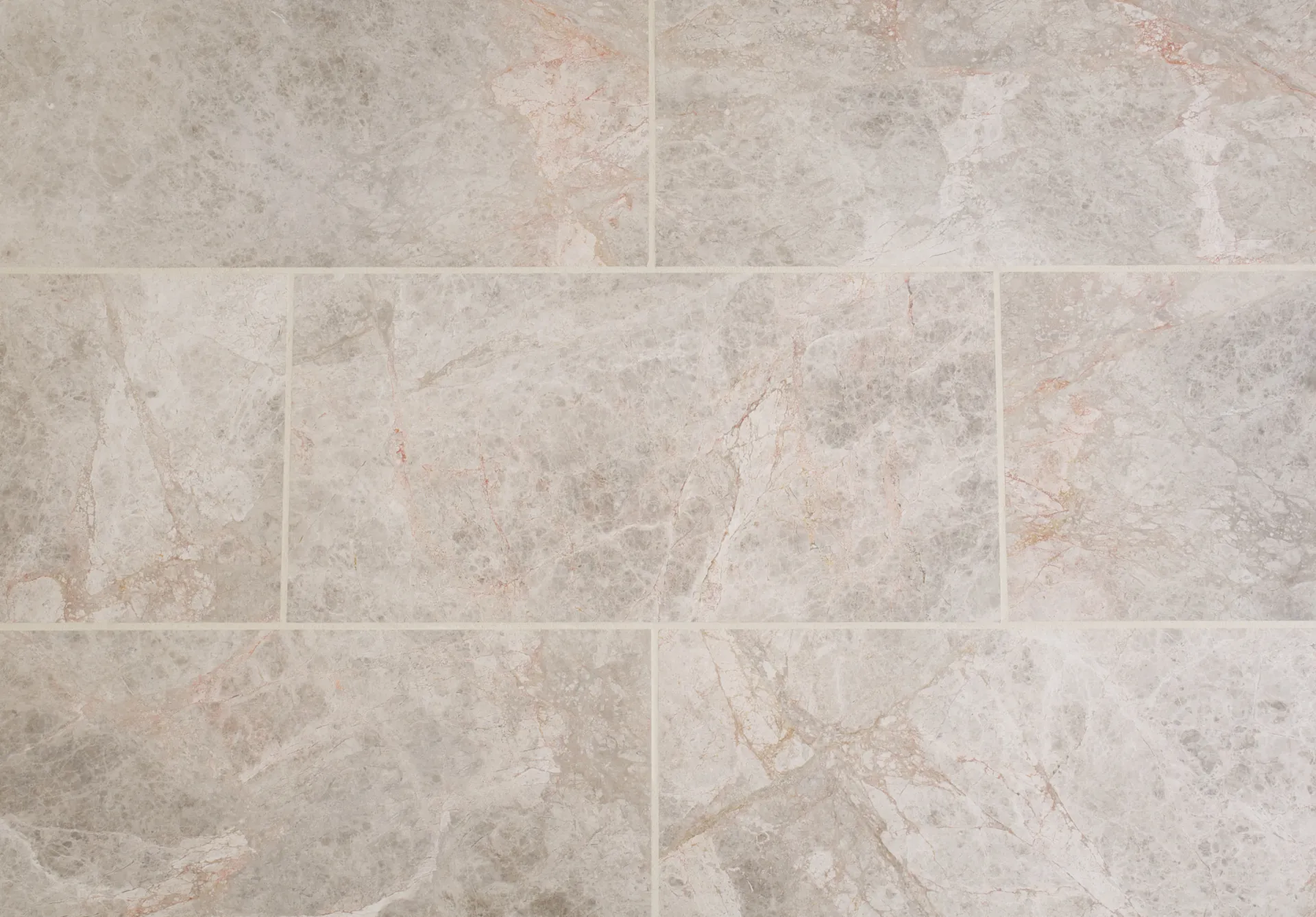 This popular marble tile has a beautiful soft silver grey background, with blended areas of warmer dark grey. Pink, bronze and blue/grey veining along with white quartz detail give the stone interest and the characteristics expected in marble. The honed finish is a more practical choice for busy kitchen areas or bathroom floors and looks stunning against plain, simple furniture or clean white bathroom suites. Please see our blog for more pictures and information.