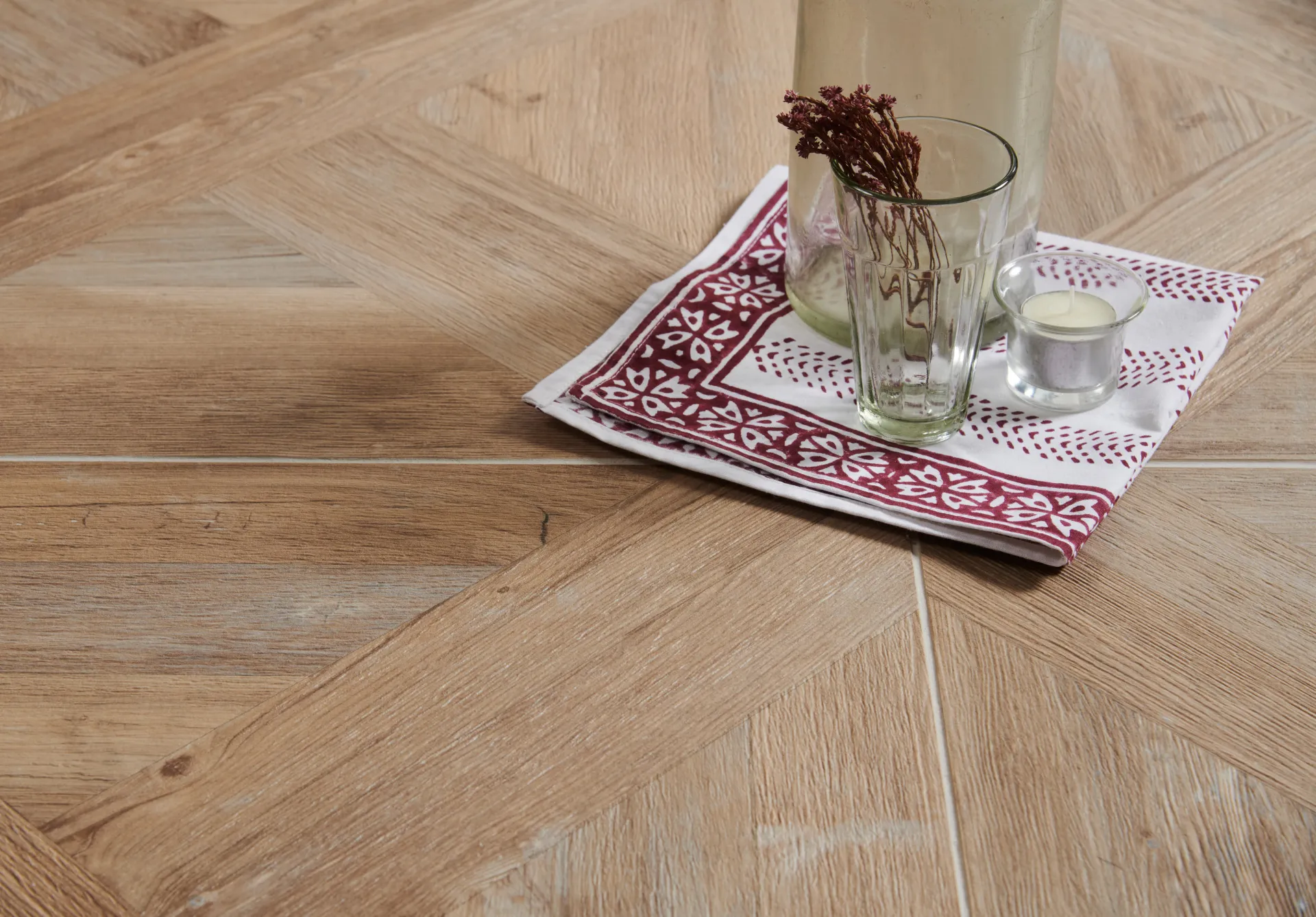 This realistic, Italian, wood-effect porcelain features subtle variation of textures and tones which are often found in traditional wooden floors.