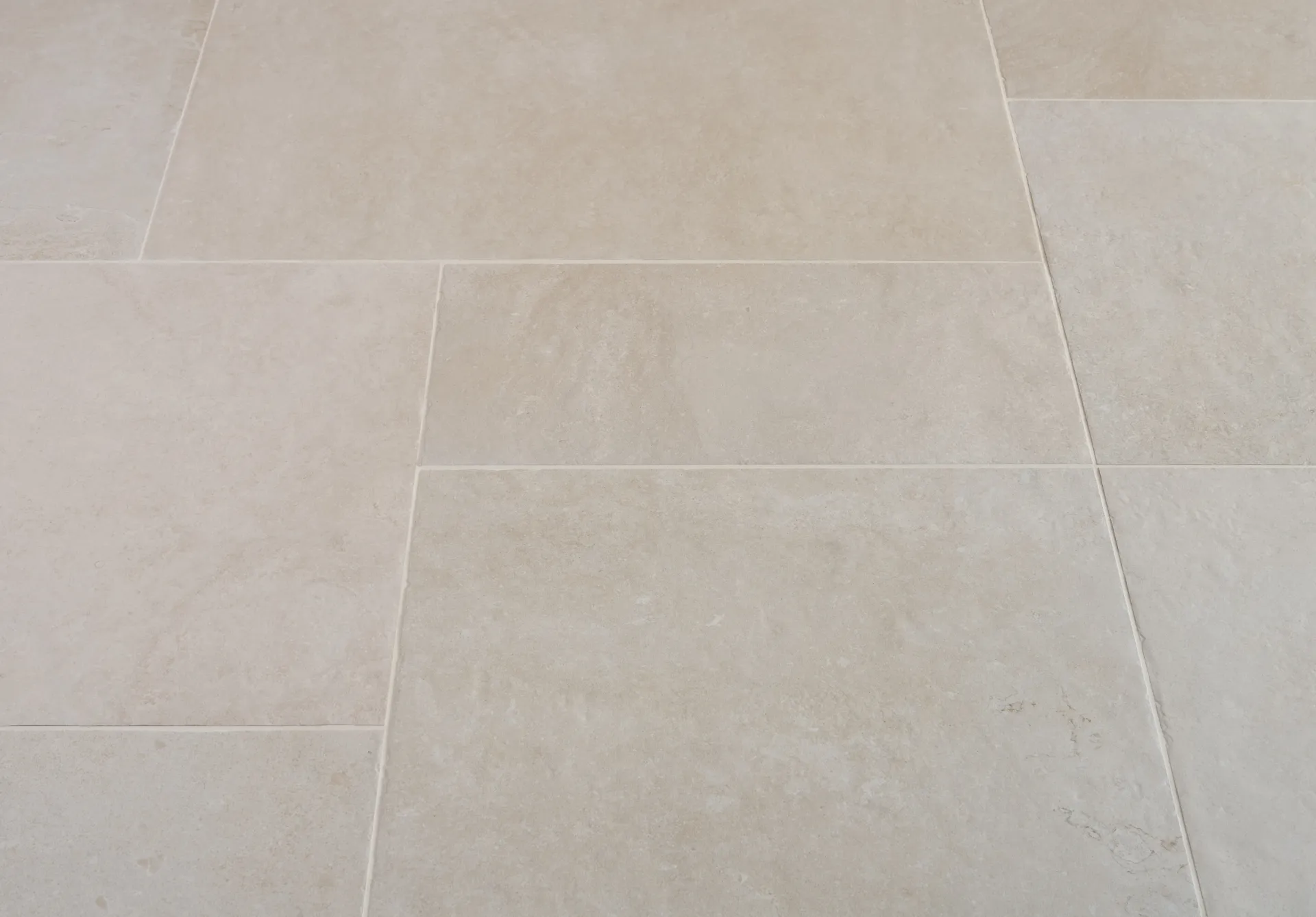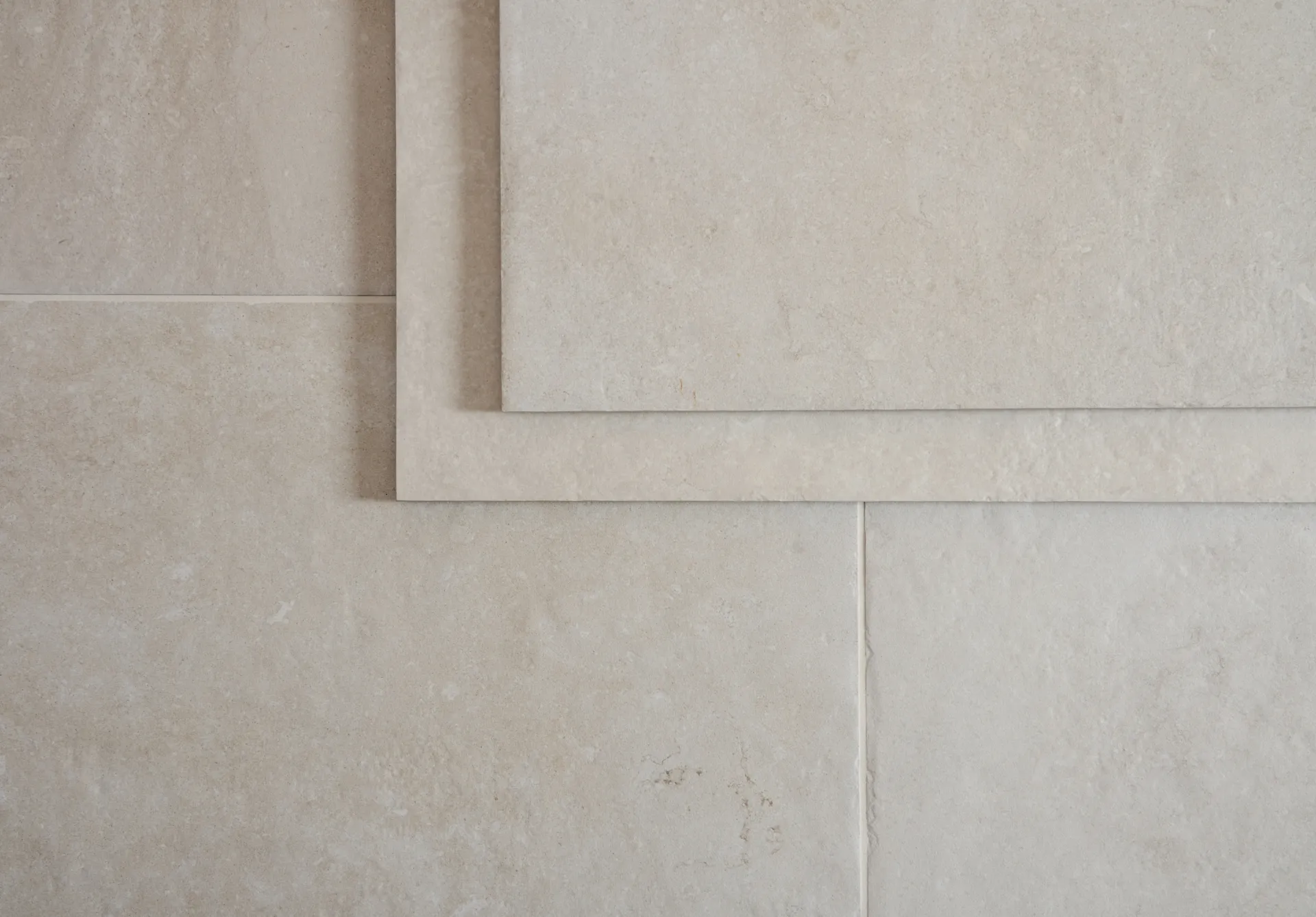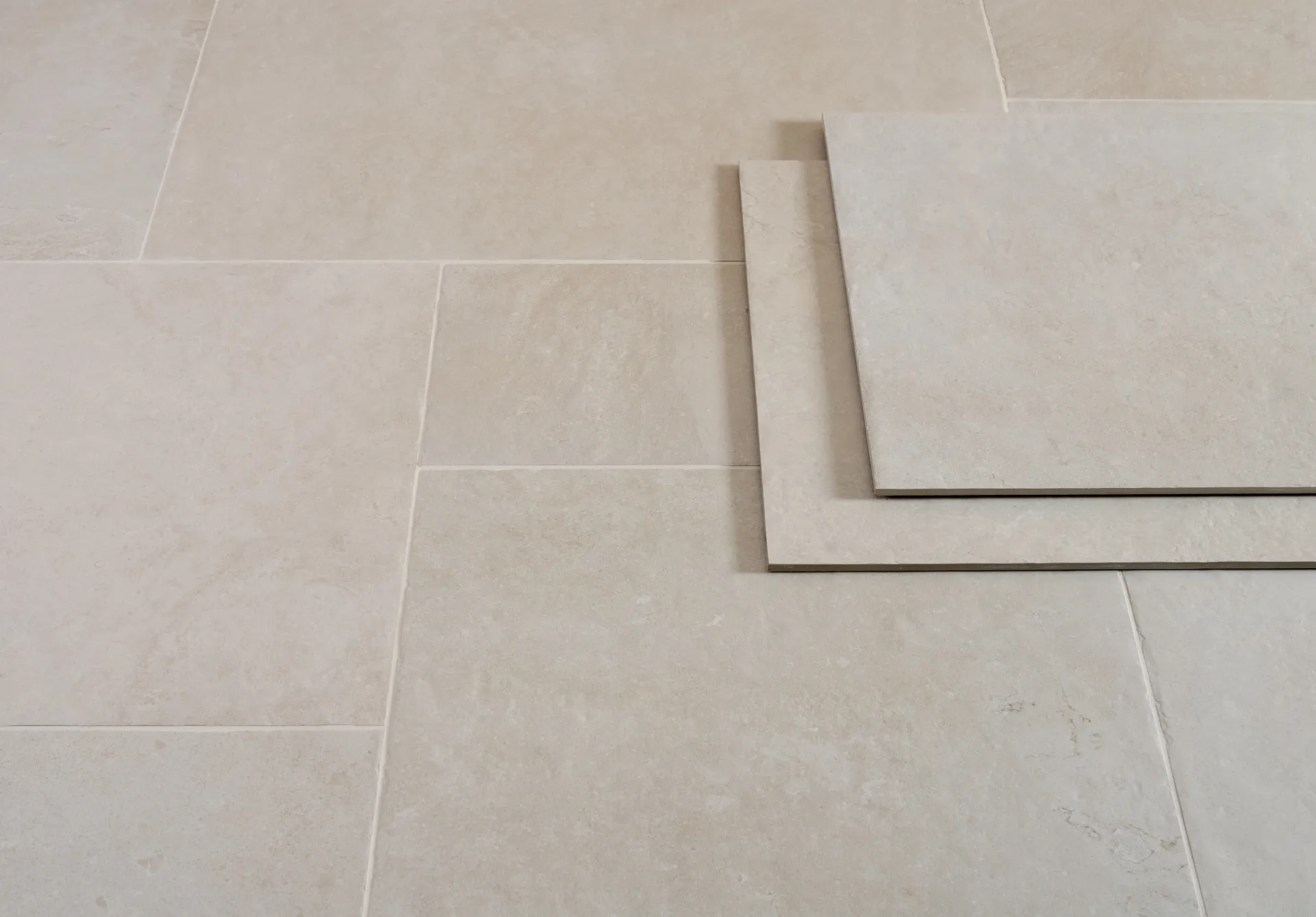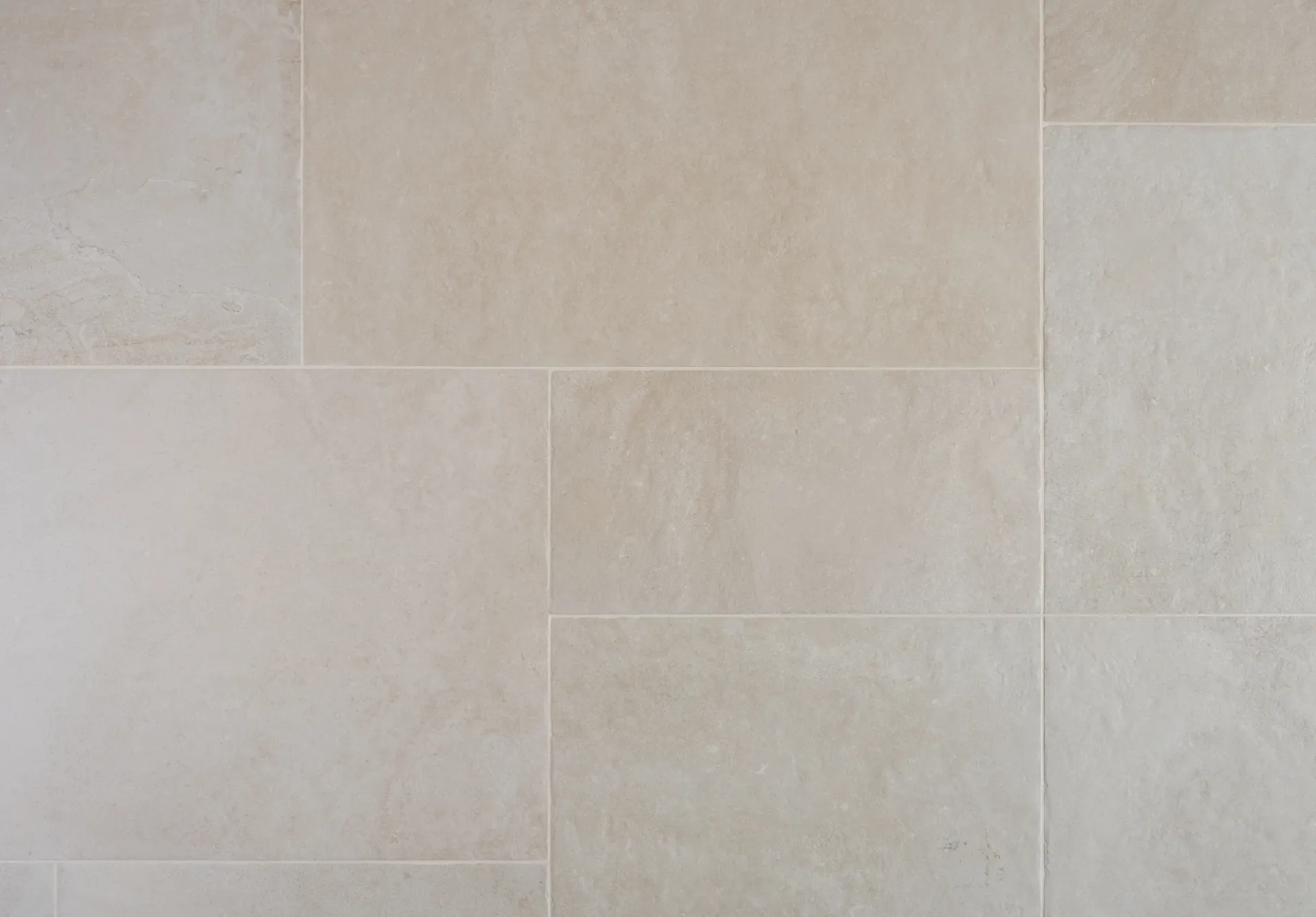 A neutral porcelain tile with distressed edges, designed to replicate a natural stone floor.