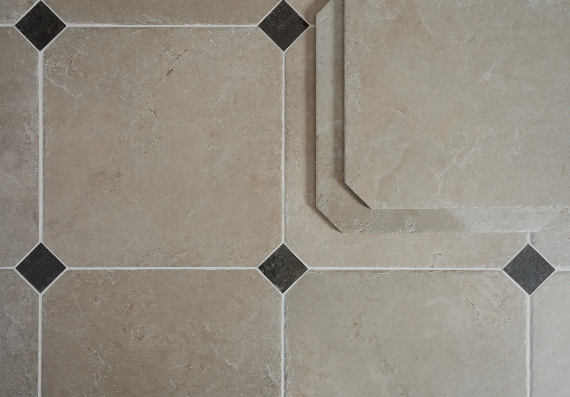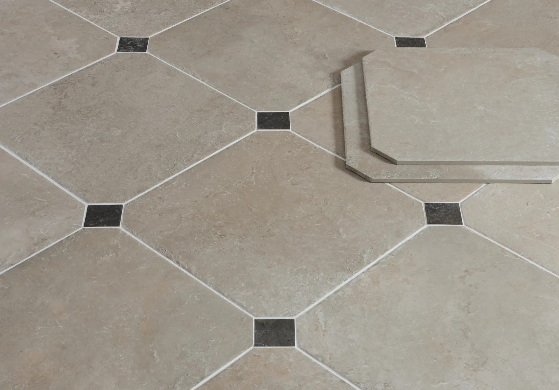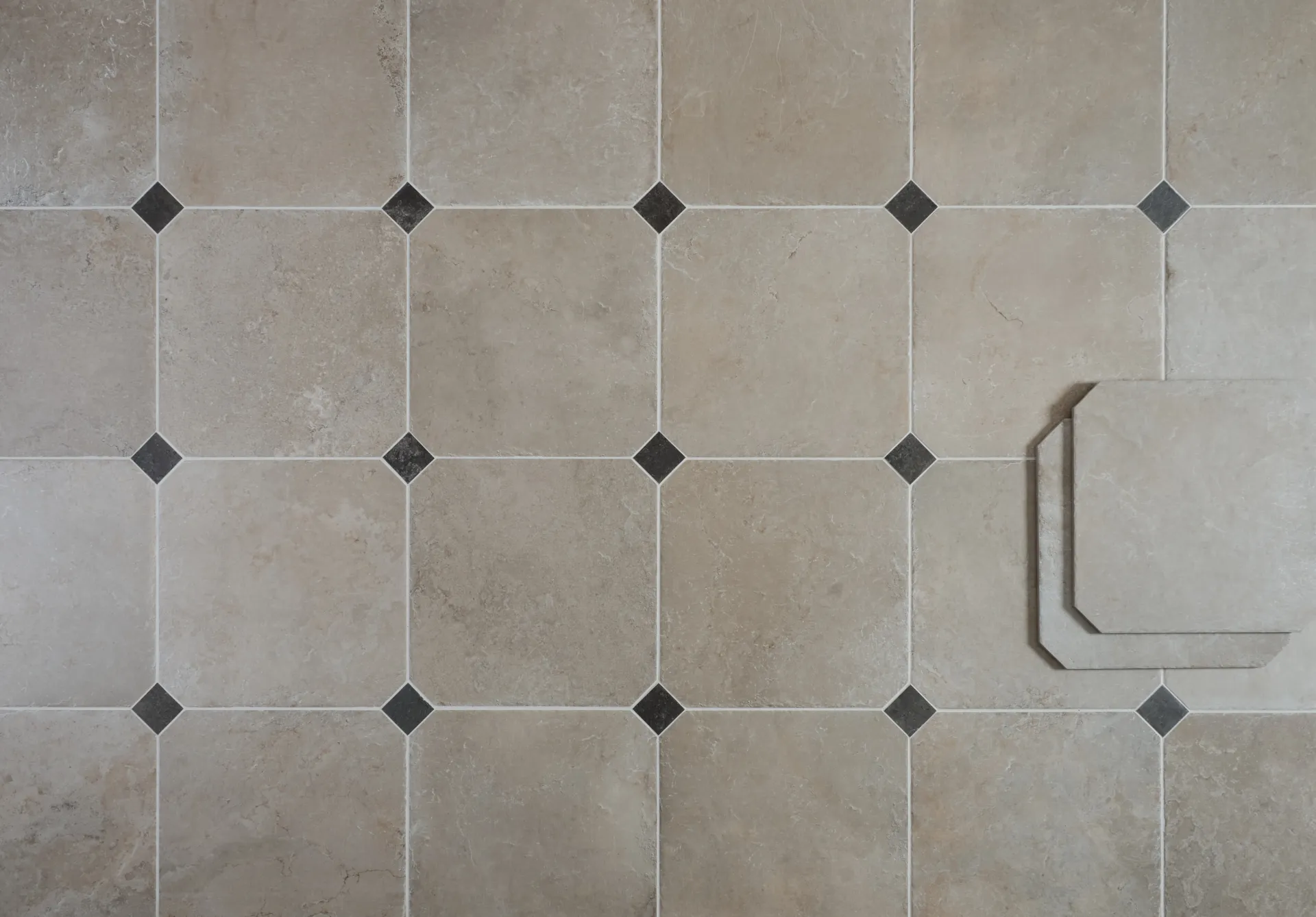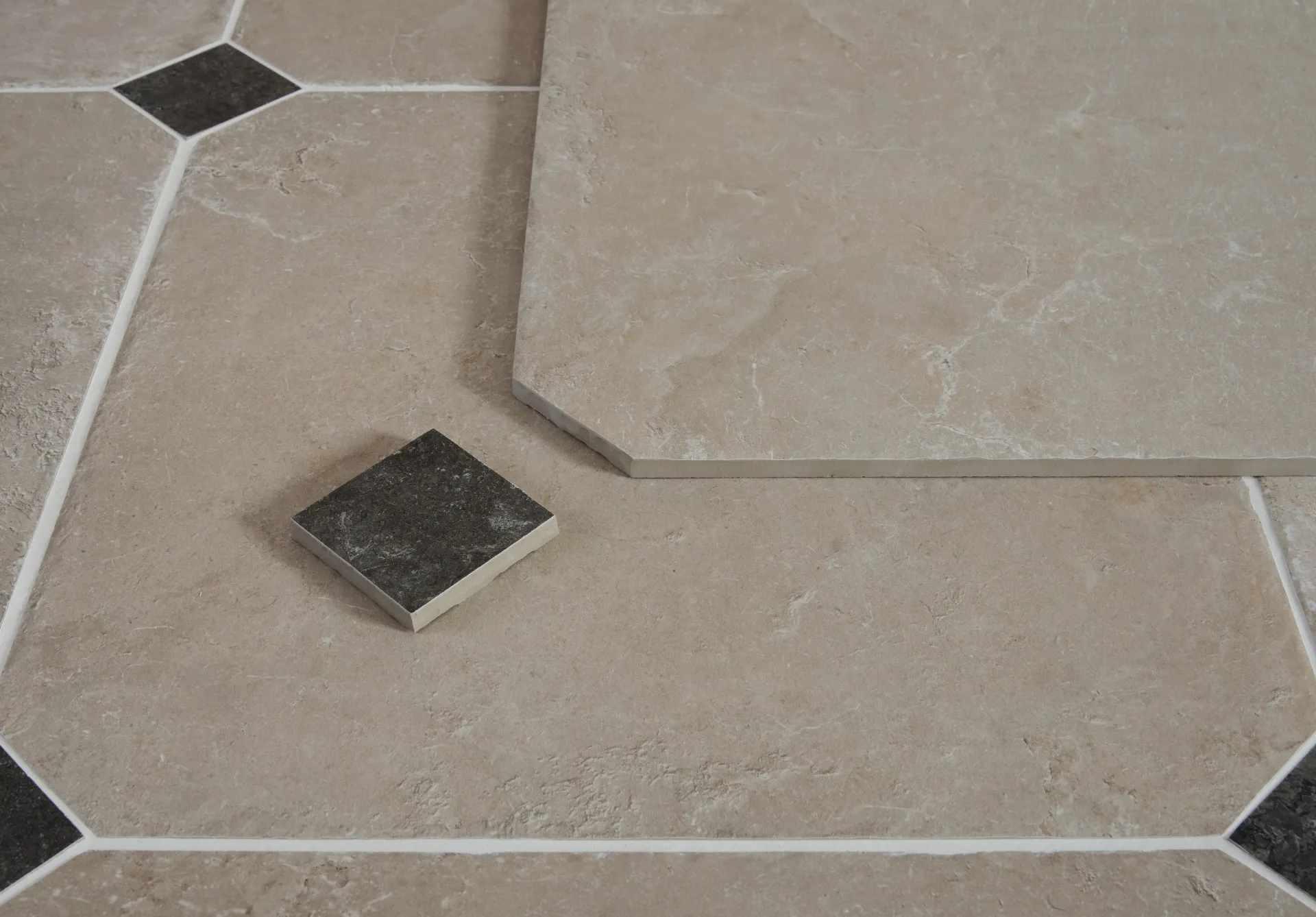Our Morella Natural Porcelain in an octagon format paired with a Morella Charcoal Porcelain diamond insert, replicating the look of a traditional floor often found in Georgian or Victorian properties.