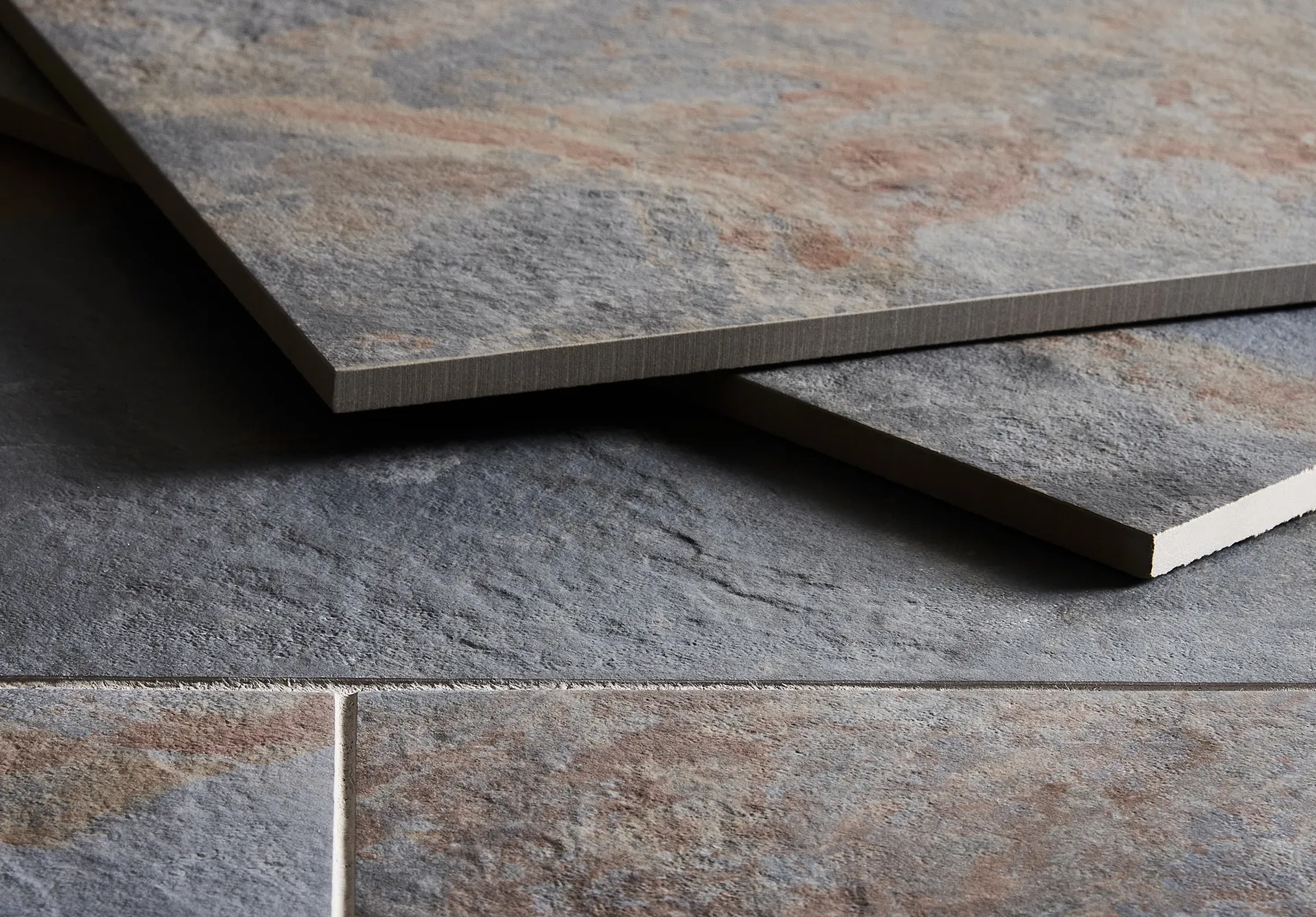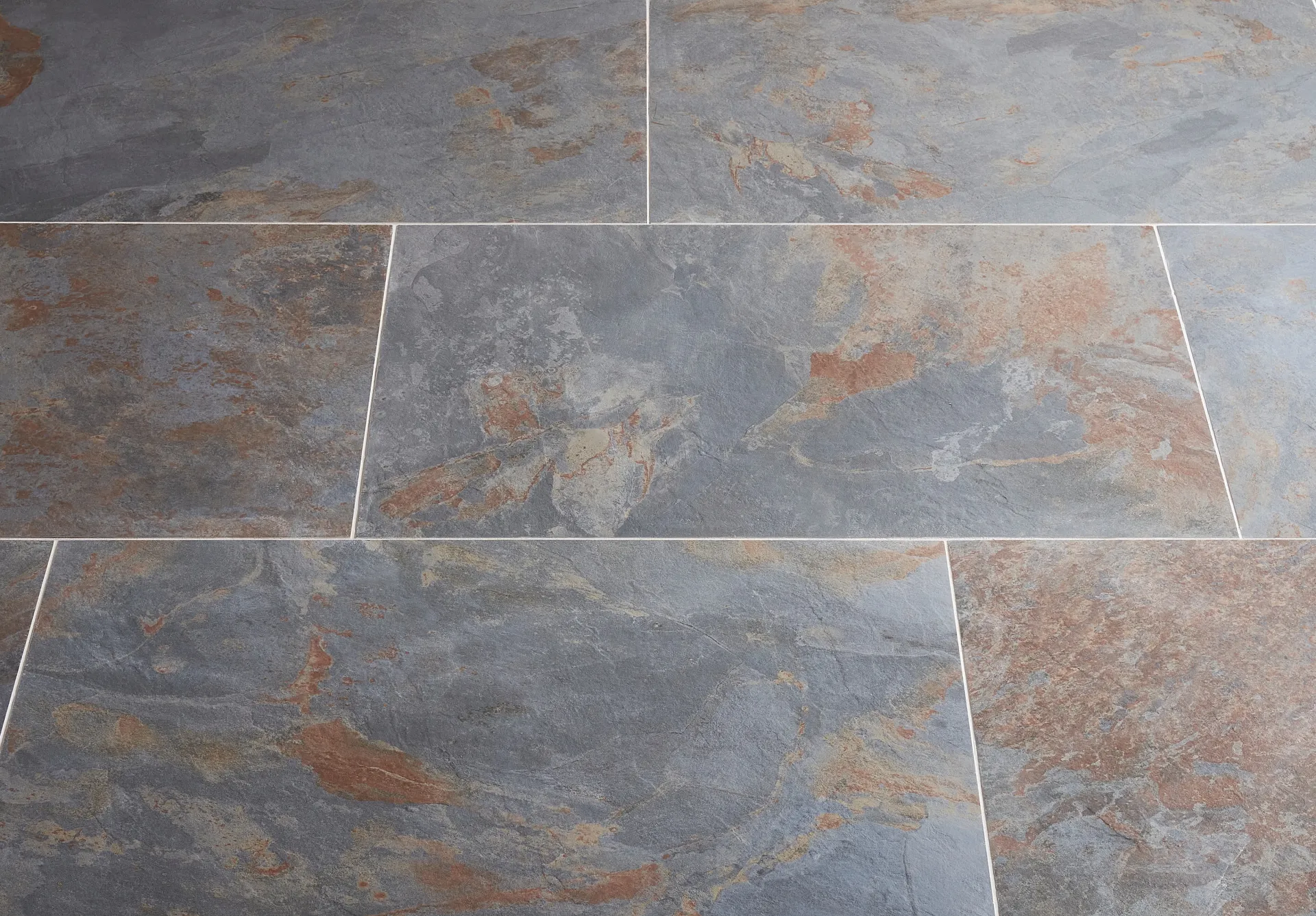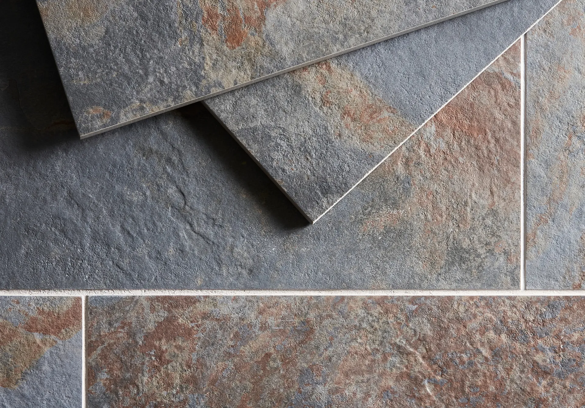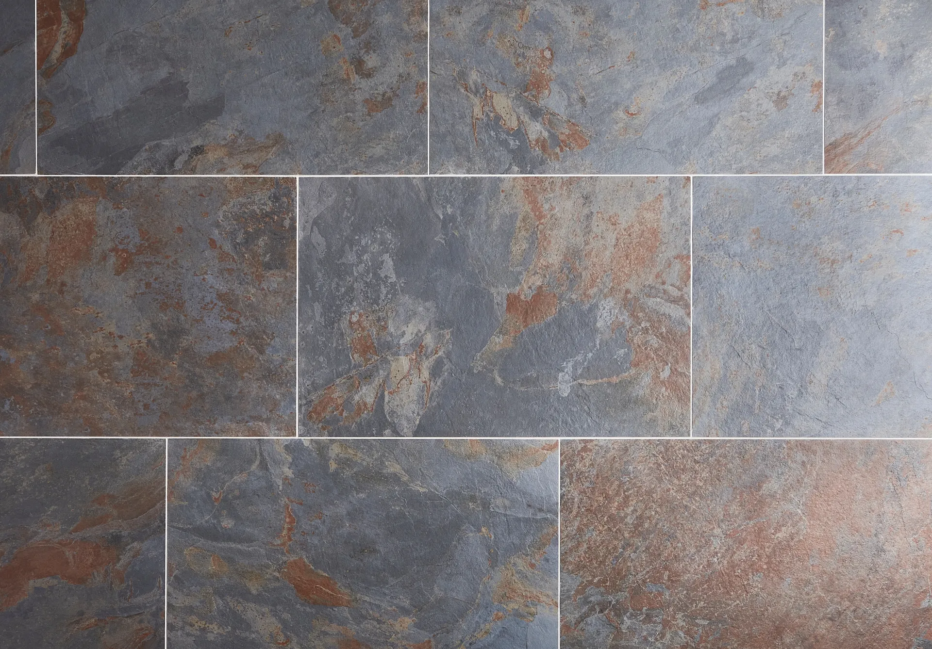 A lightly textured slate-effect porcelain tile with colours ranging from dark grey to warm, red tones.
