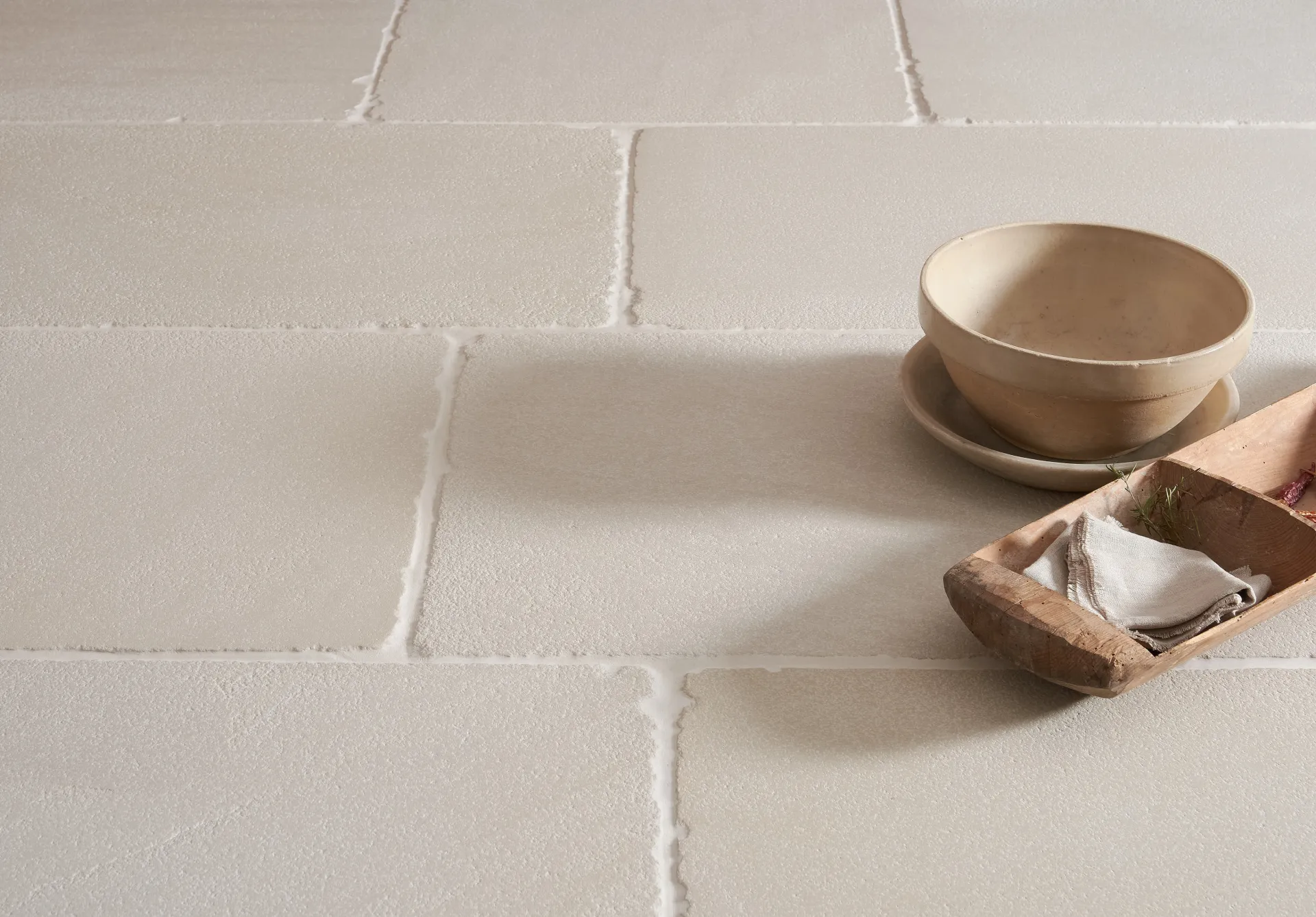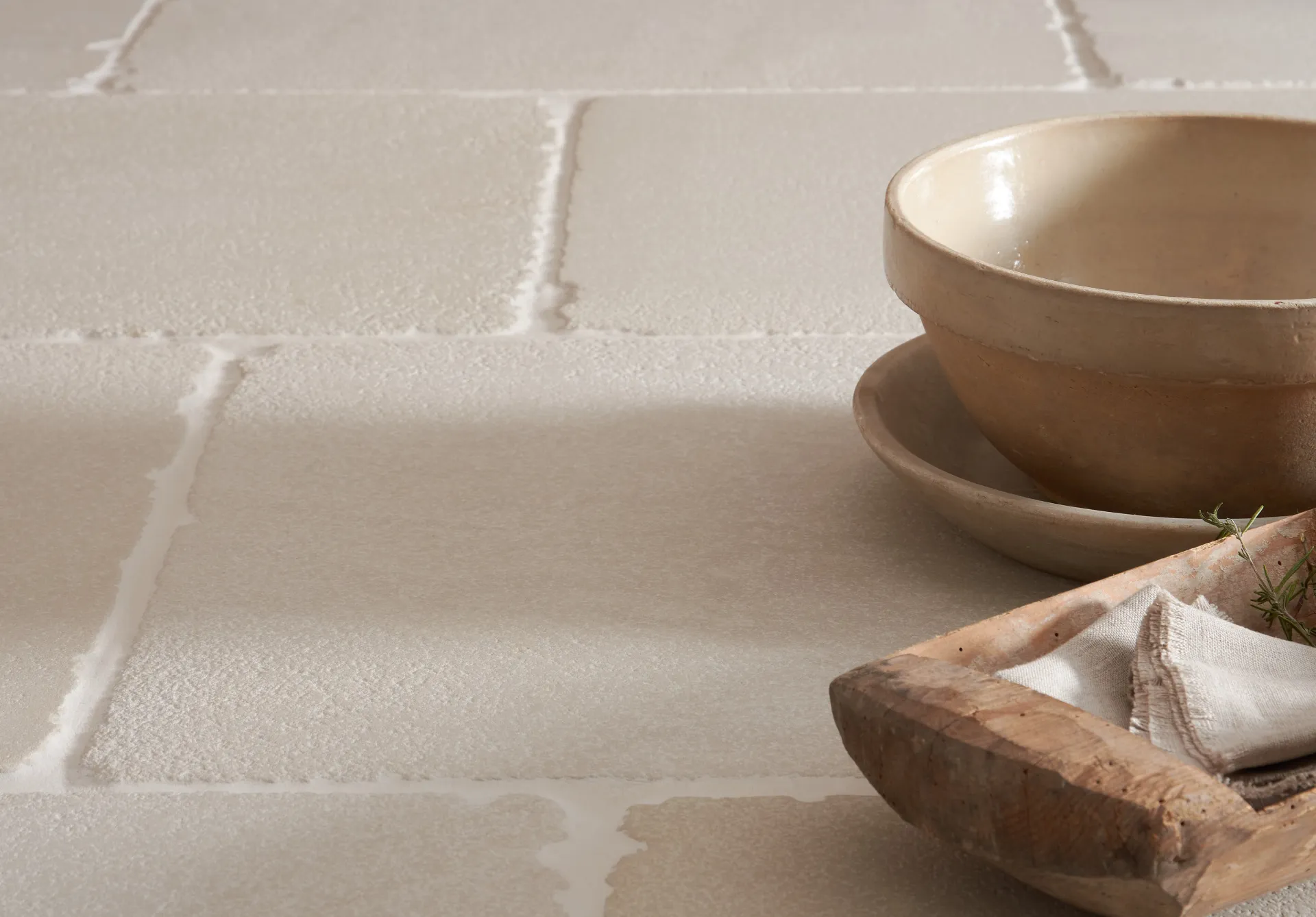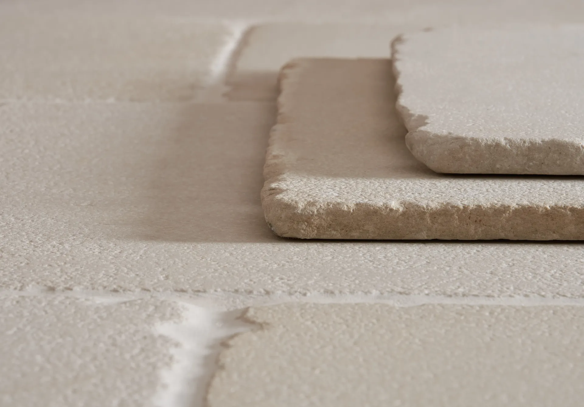 A beautiful pale oatmeal coloured tile with subtle surface texture and heavily tumbled edges.