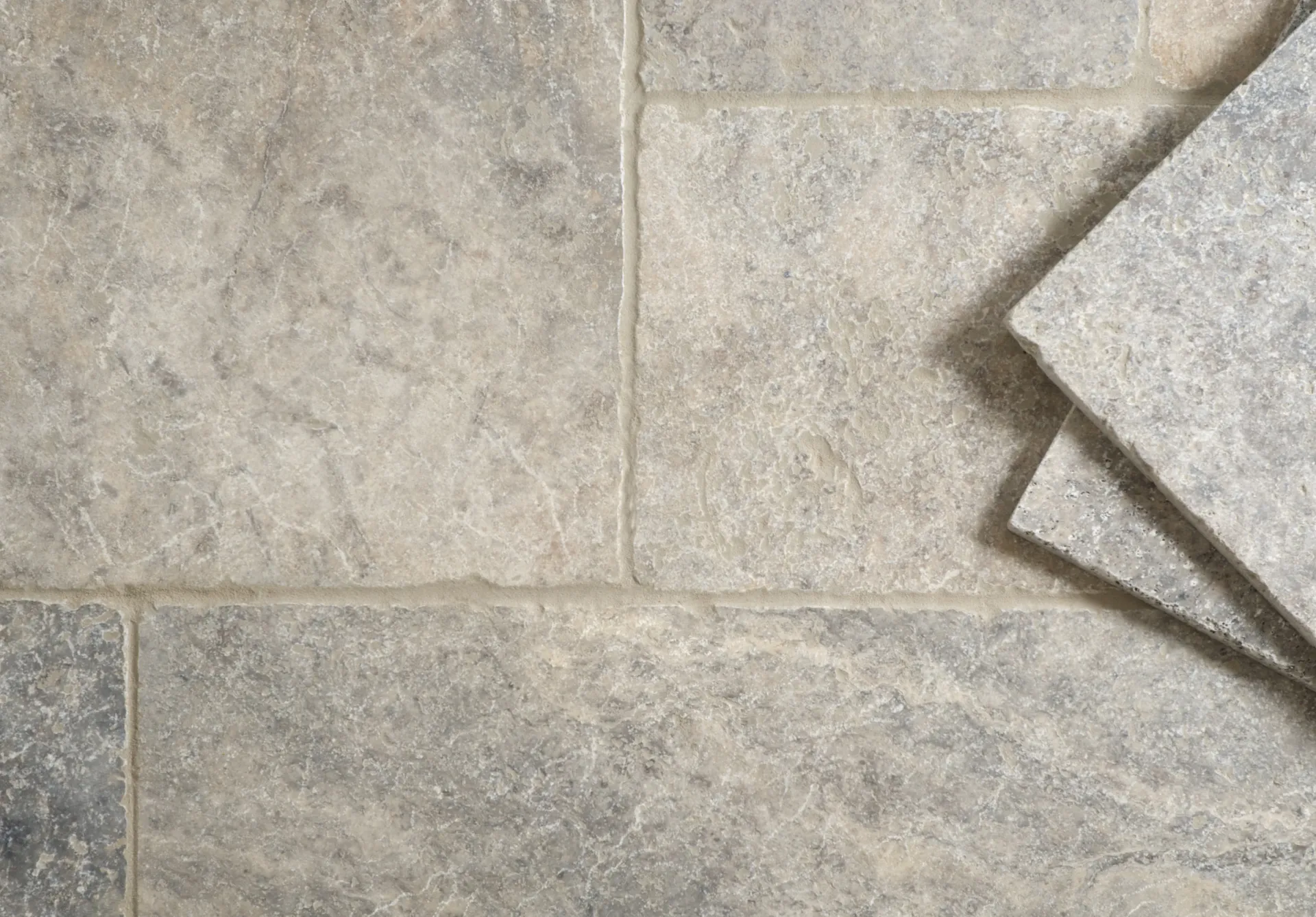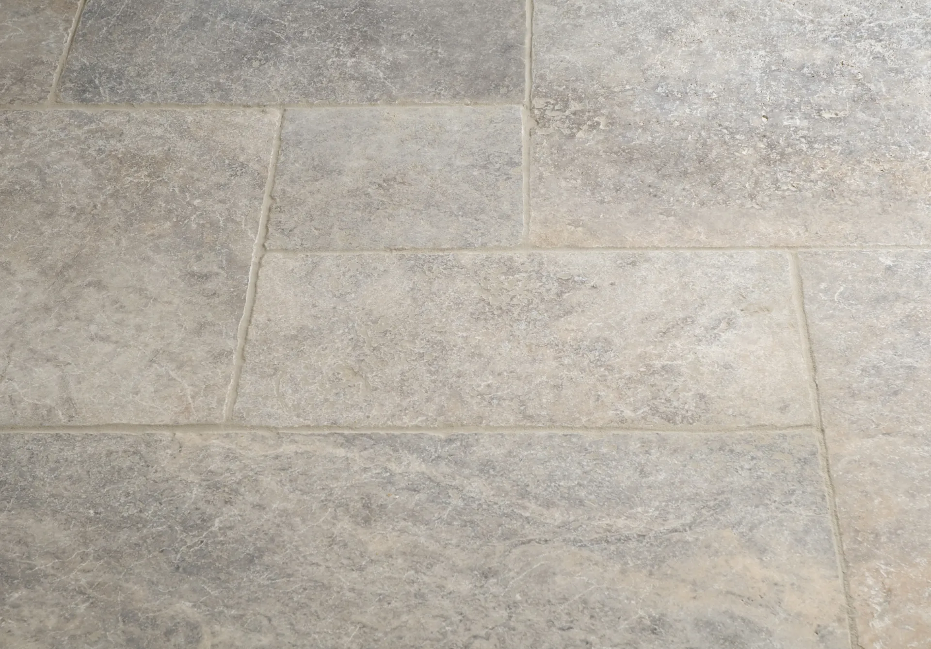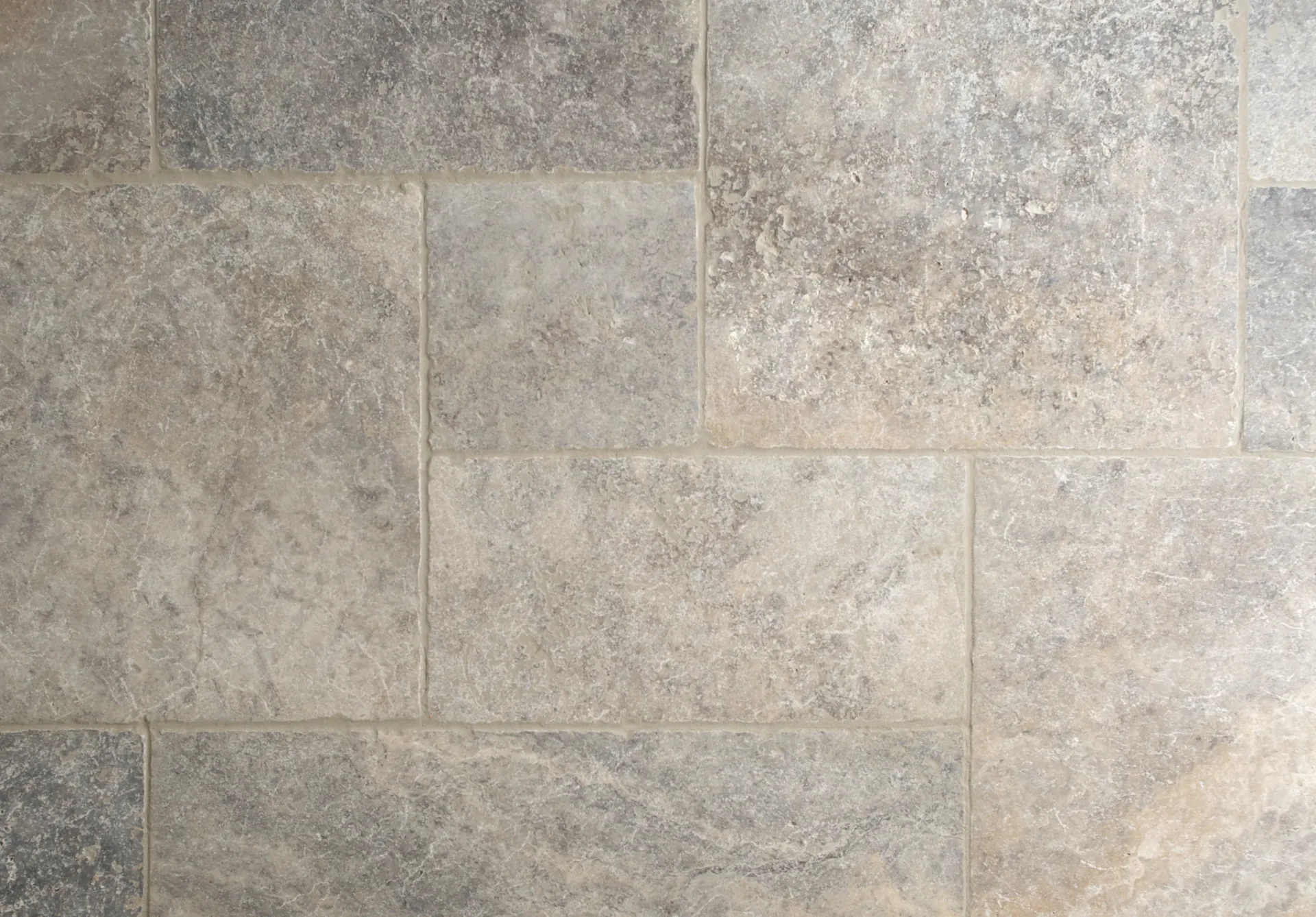 Our Silver Tumbled Travertine tiles range in colour from off-white and pale beige to darker grey and silver tones, with distinct marbling, pits and quartz detail throughout.