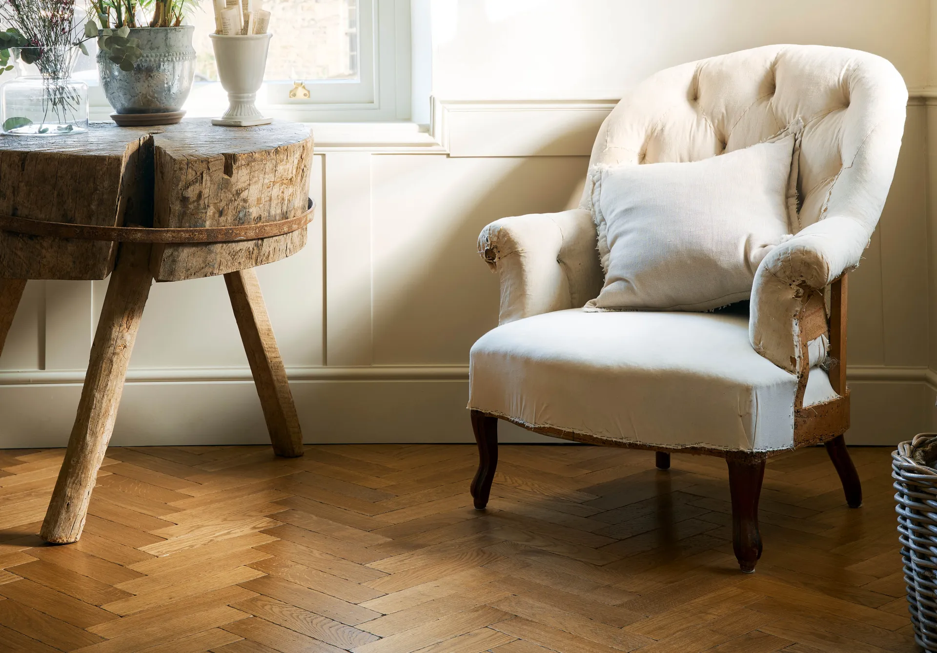 Our parquet blocks have been gently distressed, creating softly worn edges and subtle surface texture to give the appearance and feel of an age-worn parquet floor. Suitable for use with underfloor heating, the parquet can be used throughout the home, and only needs to be finished with a top coat of our Classic Hardwax Oil upon installation. As there is no need for sanding, the blocks are easier and less expensive to lay than unfinished or reclaimed parquet. Please note, the parquet blocks arrive with customers semi-finished, so will change appearance slightly and mellow once the hardwax oil is applied. Our samples arrive with customers fully finished, to give a true indication of the installed product.